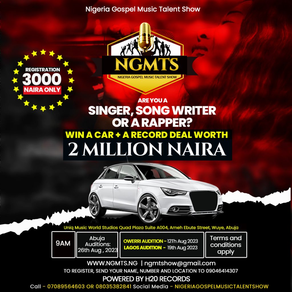 Audition Owerri, 12th August @ H20 Studio, behind FUTO back gate, Owerri Lagos 19th August @ Top World Studio, lekki. Abuja 26th August @ Uniq Music World, Quad Plaza Wuye Abuja.
